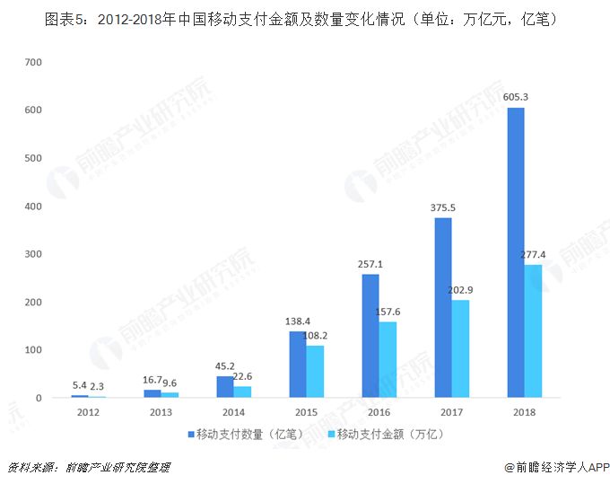 據(jù)中國支付清算協(xié)會最新數(shù)據(jù)顯示,2017年,中國移動支付規(guī)模達202.93萬億元,全球排名第一,近五年移動支付規(guī)模年復合增速高達117.6%;2018年,中國移動支付業(yè)務(wù)605.3億筆,金額277.4萬億元,同比分別增長61.2%和36.7%。