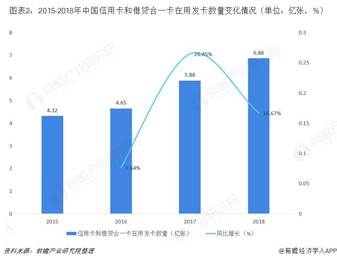 信用卡發(fā)卡數(shù)量逐年增長,增速高于銀行卡在用發(fā)卡數(shù)量,2018年信用卡和借貸合一卡在用發(fā)卡數(shù)量為6.86億張,同比增長16.73%。