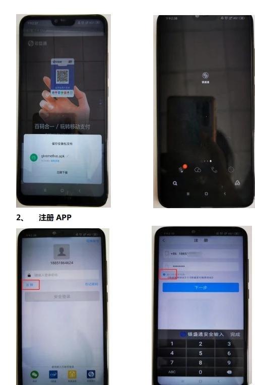 2.1:下載APP并注冊:新用戶入網蘋果或者安卓手機在商城/應用商店直接搜索“銀盛通”,下載APP后點擊注冊,輸入手機號,密碼(6-22數字+字母),獲取驗證碼