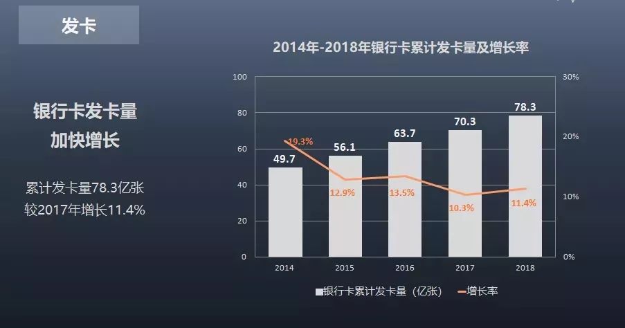 從發(fā)卡情況來看,截至2018年底,我國銀行卡累計(jì)發(fā)卡量為78.3億張。