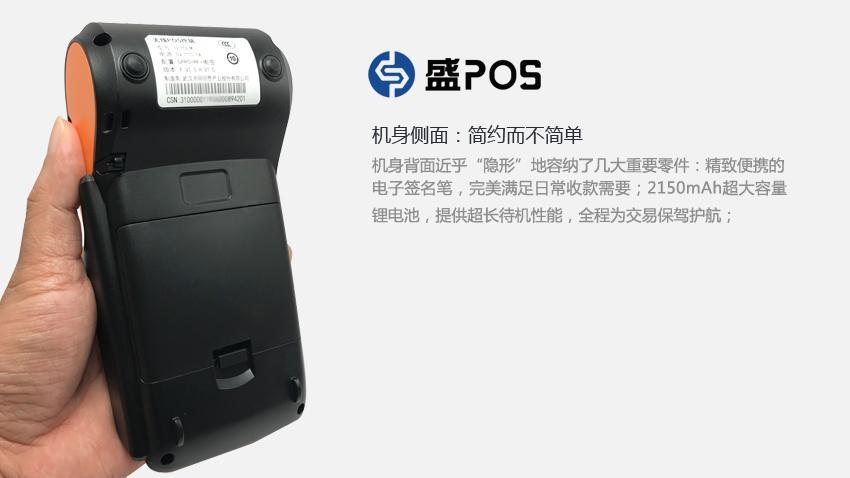 機(jī)身背面近乎“隱形”地容納了幾大重要零件:精致便攜的電子簽名筆,完美滿足日常收款需要;2150mAh超大容量鋰電池,提供超長(zhǎng)待機(jī)性能,全程為交易保駕護(hù)航;雙卡槽待機(jī),提供強(qiáng)大的GPRS無(wú)線通訊,讓用戶暢享安全、可靠、便捷的支付體驗(yàn)。